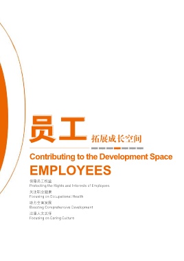 员工 拓展成长空间 Contributing to the Development Space EMPLOYEES 保障员工权益 Protecting the Rights and Interests of Employees 关注职业健康 Focusing on Occupational Health 助力全面发展 Boosting Comprehensive Development 注重人文关怀 Focusing on Caring Culture